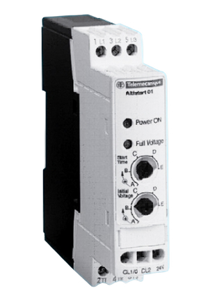 Устройства плавного пуска и торможения ATS01и ATS22 обеспечивают ограничение пускового тока за счет управления величиной напряжения в двух фазах питания двигателя. На лицевой стороне ATS01 находятся потенциометры которые позволяют настроить следующие параметры работы: